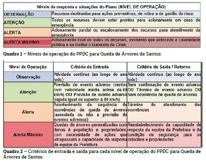 O PPDC para Queda de Árvores para Santos está sendo estruturado para ser operado em quatro fases, que são os Níveis de Operação.